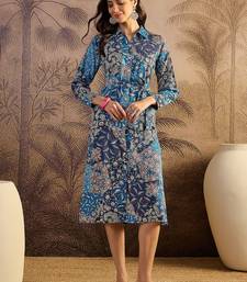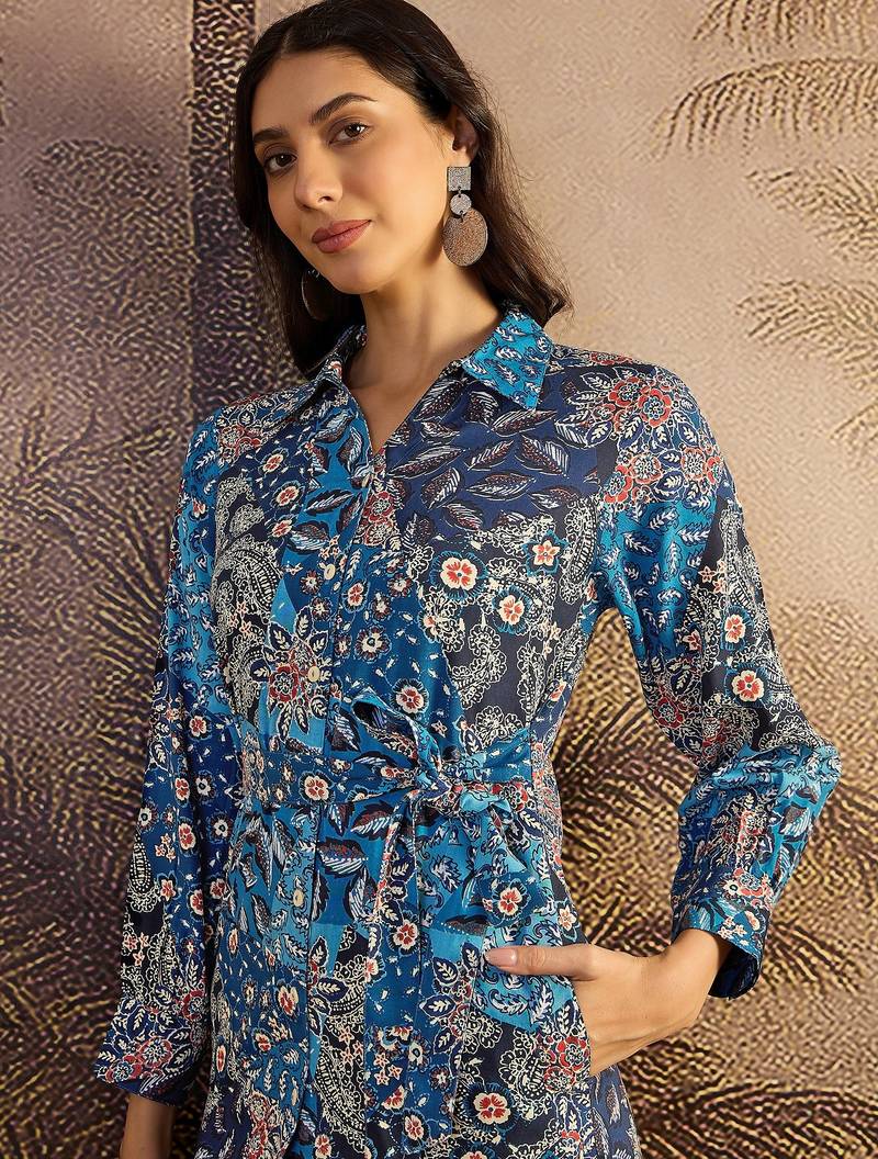 | Product Description | Shirt Dress (Button Down Front With A Collar) Intricate Kalamkari Floral And Vine Motifs A Deep Navy Blue Base With Contrasting Beige/Cream Floral Details And Vibrant Blue Accents A Line Midi Dress With A Waist Tie/Belt For A Structured Fit. Full Length Sleeves (As Seen On The Model. Typically Crafted From Viscose Blend, Which Is Standard For This Type Of Hand Block Or Screen Printed Ethnic Wear To Ensure Breathability. |