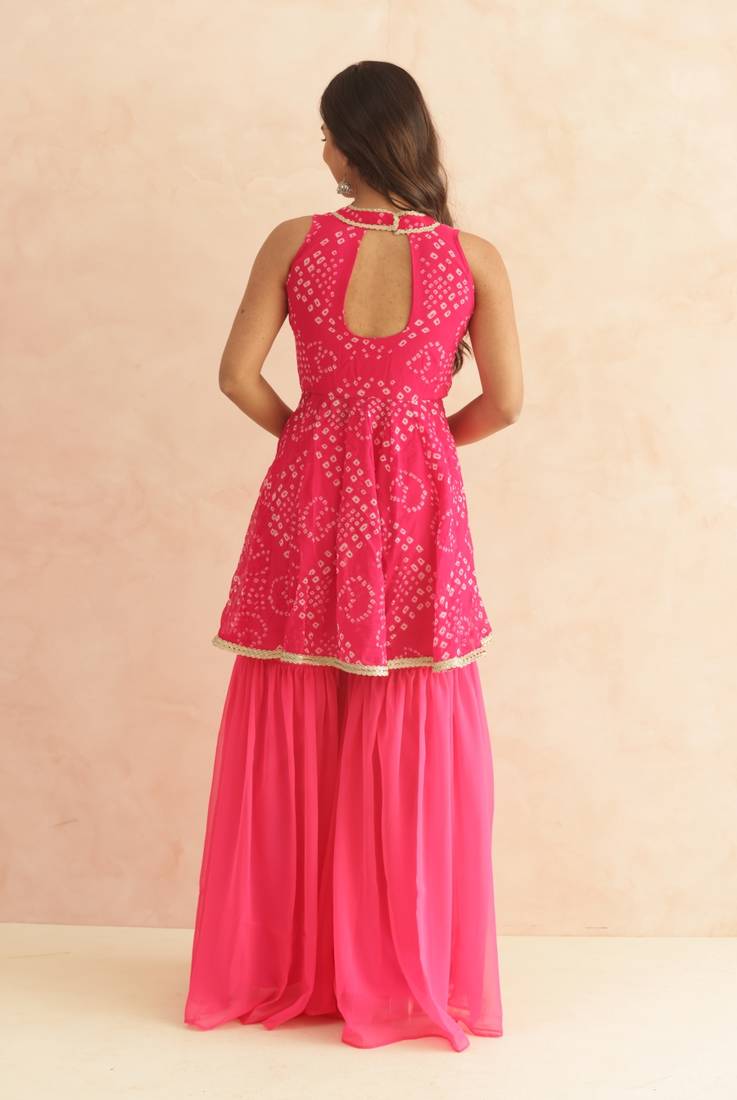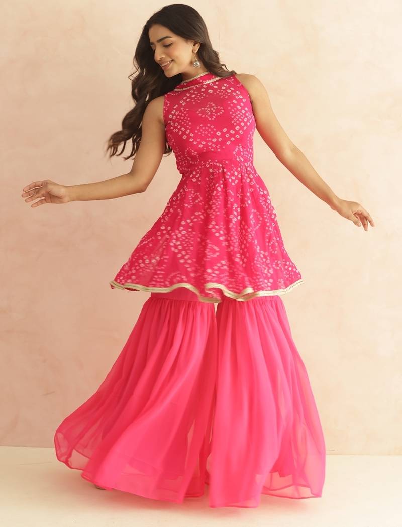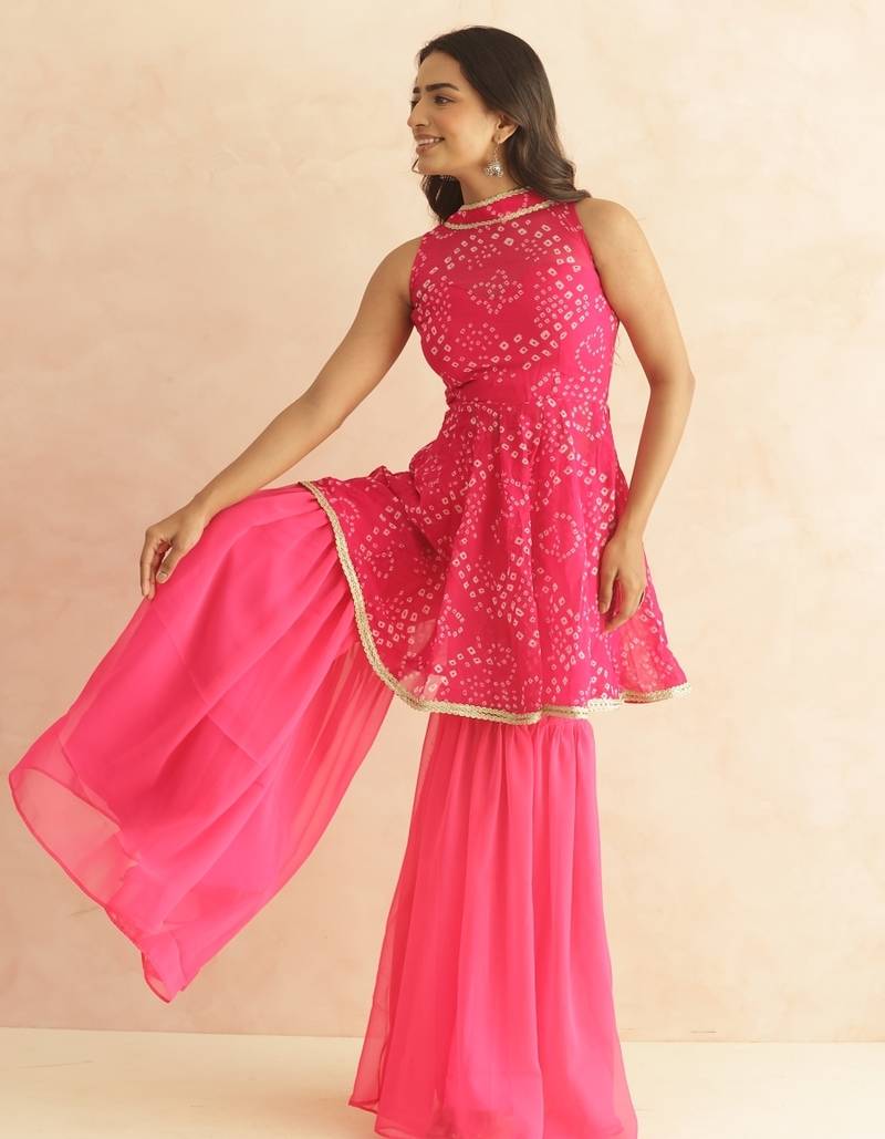 | Product Name | Prisha Pink Bandhej Sharara Coord Set | |