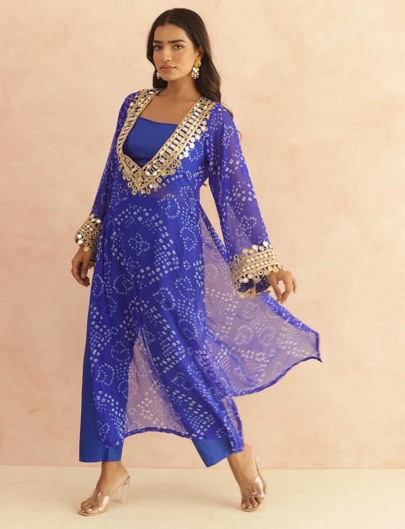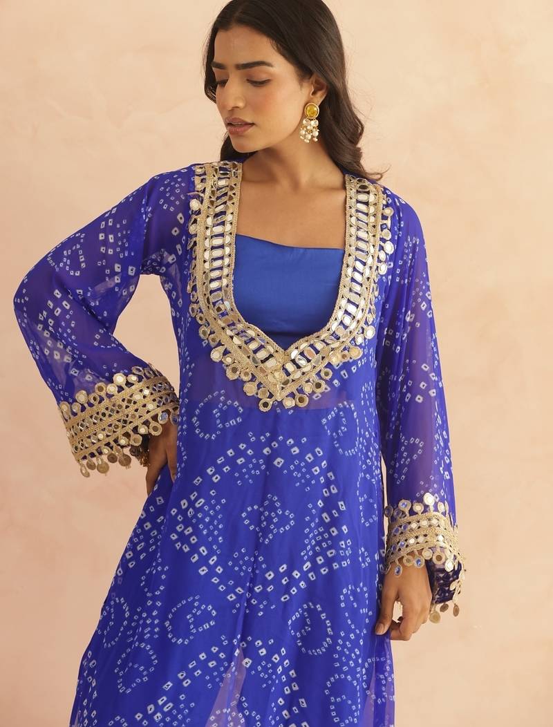 Ravina royal blue bandhej mirror lace work fusion set stitched