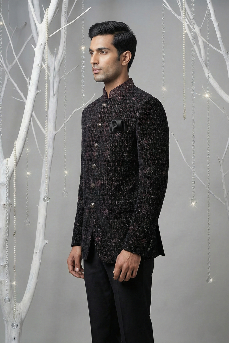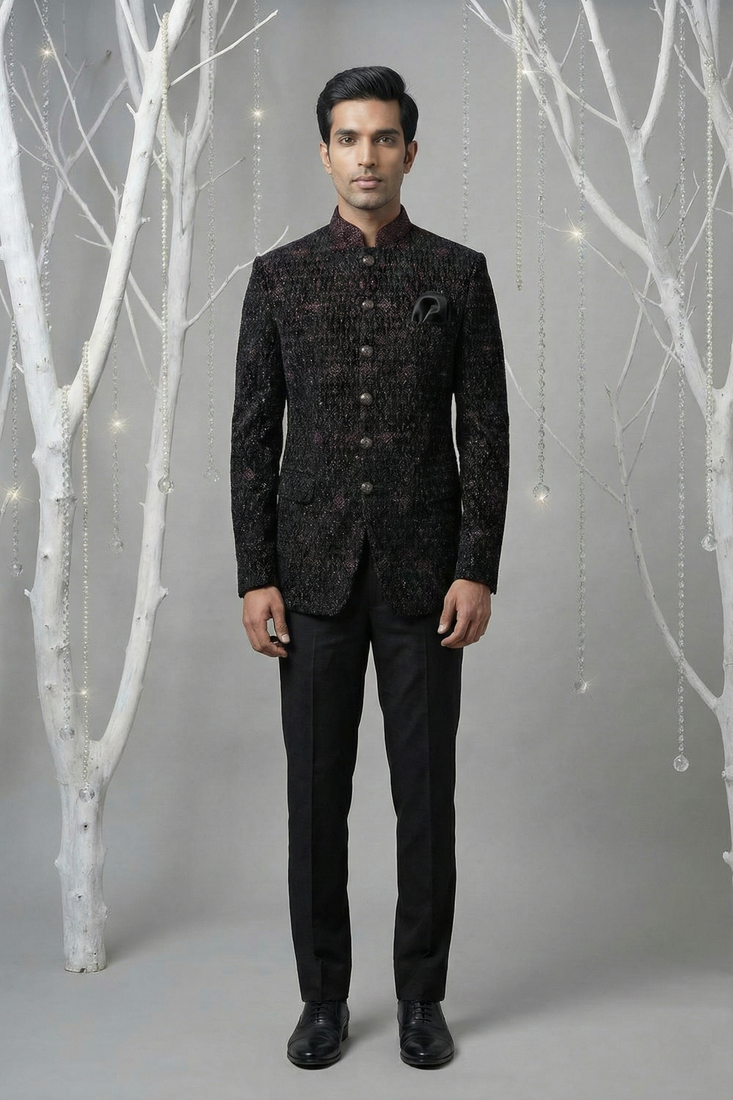 | Product Name | Black Thread Embroidered Bandhgala With Collar Embroidery On Velvet | |