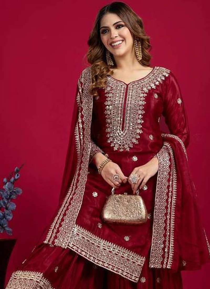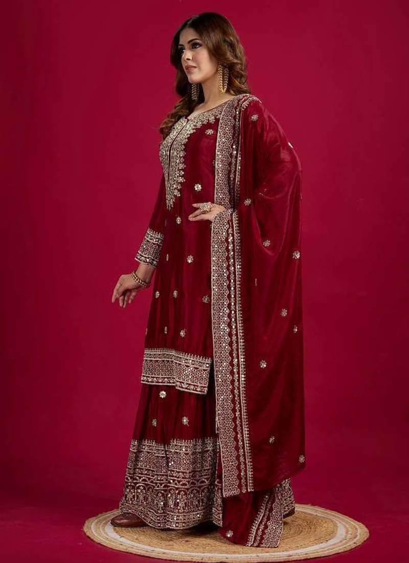 | Product Name | Maroon Color Heavy Sequins Work Chinon Fabric Wedding Wear Sharara Dress | |