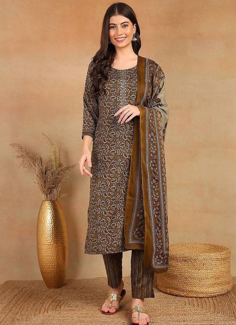 | Product Name | Women Brown Rayon Blend Ethnic Motifs Printed Straight Kurta Trouser With Dupatta | |