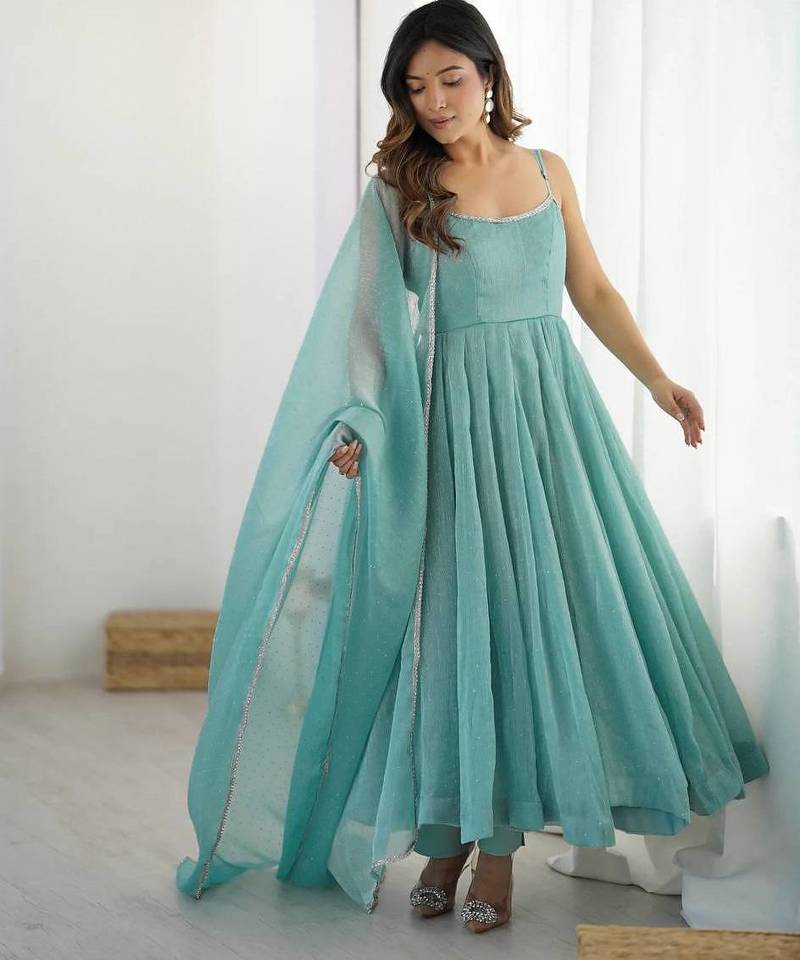 Crunchy silk fabric with siroski work anarkali with pant and dupatta set stitched