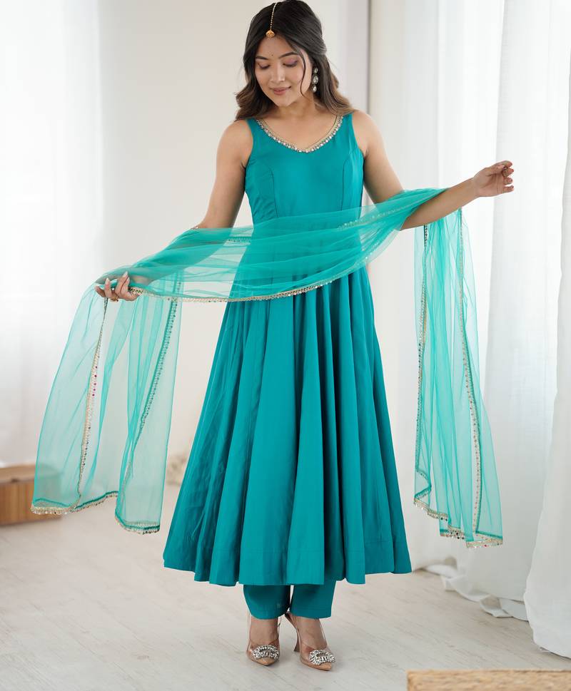 Pure romansilk chanderi fabric fully flare anarkali with pant dupatta set ready to wear stitched