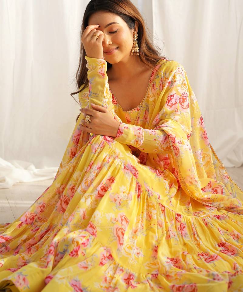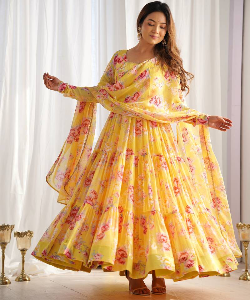 Pure soft fox georgette fully flare printed anarkali,with duppta set,pent ready to wear stitched