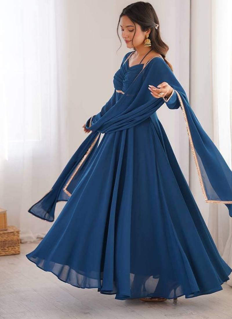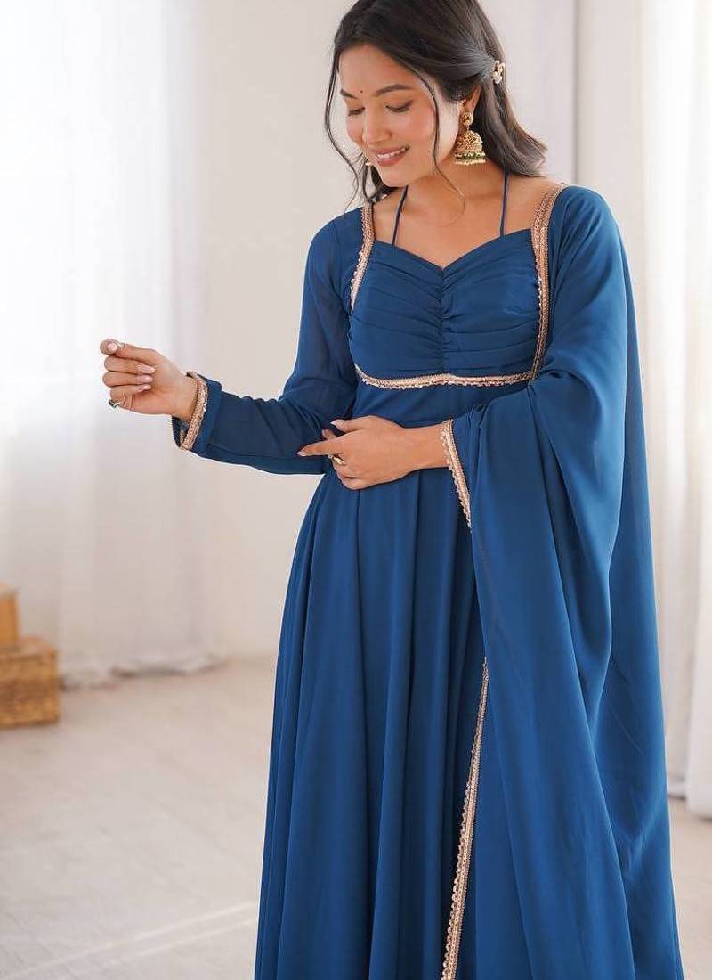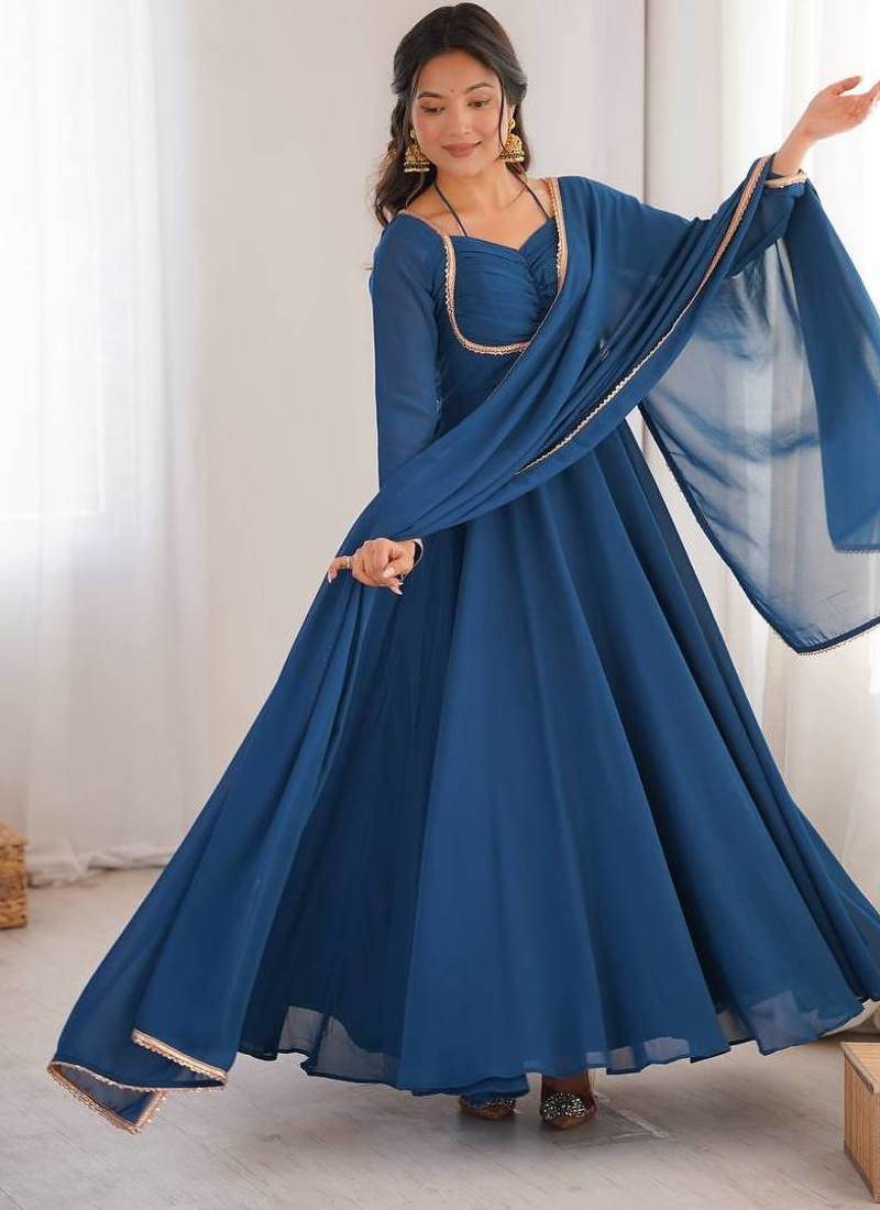 Rama colour heavy pure fox bloming georgette 7 mtr plus flare gown pant with dupatta stitched