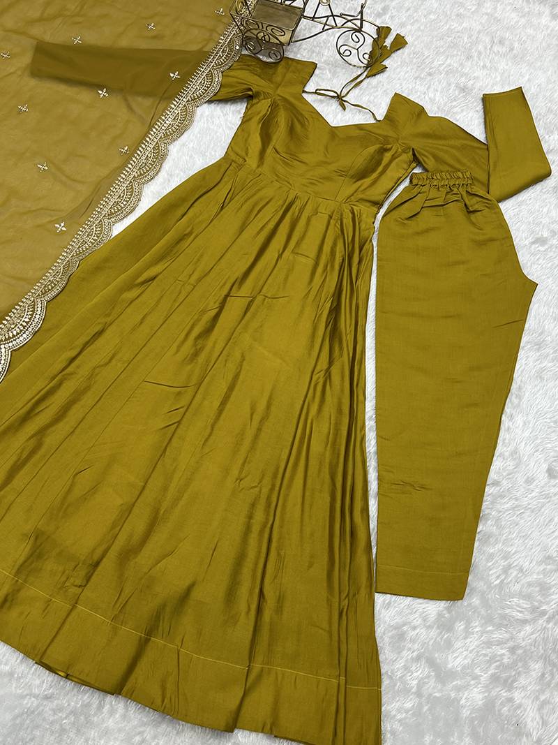 Women pure romansilk chanderi fully flair anarkali pant with dupatta set stitched