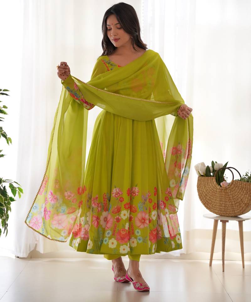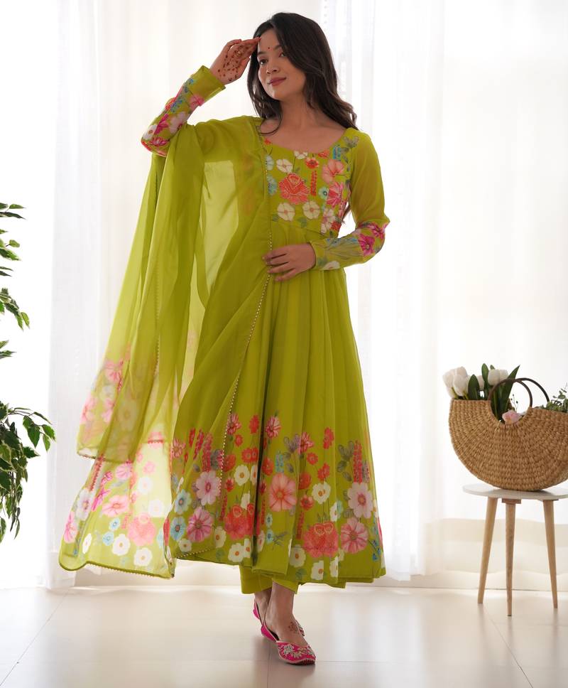 Women soft organza silk with print fully flair anarkali pant with dupatta set stitched
