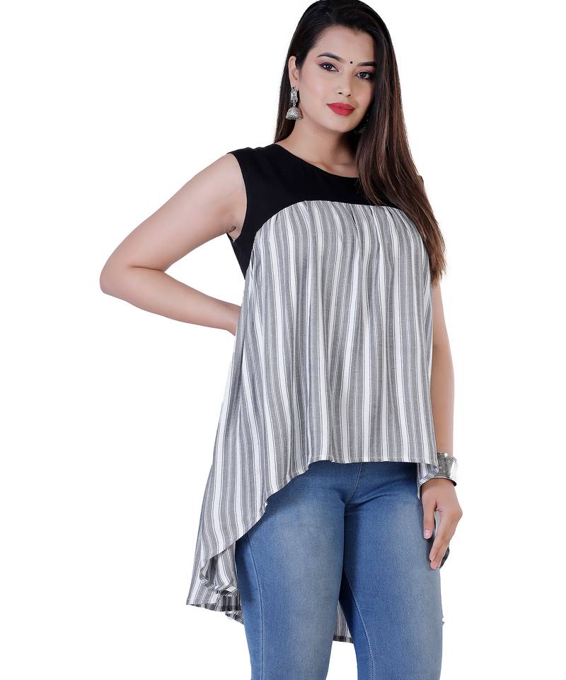 Elevate Your Everyday Style With This Chic And Contemporary Women’s Striped High Low Tunic. This Unique Piece Features A Sophisticated Colorblock Design, Combining A Solid Black Sleeveless Yoke With A Flowy, Vertically Striped Body. The Standout Feature Is The Shark Bite (Fish Cut) Hem, Which Provides A Dramatic, Flared Silhouette That Is Both Flattering And Comfortable. Whether You're Heading To A Casual Brunch Or A Summer Outing, This Versatile Western Wear Piece Can Be Styled As A Longline Top Or A Short Flare Dress, Making It A Must Have For The Modern Wardrobe. Pair This Tunic With Black High Waisted Denim Shorts And Red Sneakers (As Shown In The Image) For A Bold, Sporty Chic Look, Or Swap For Skinny Jeans And Sandals For A More Polished Afternoon Vibe. Women's Striped High Low Sleeveless Dress Dress|Shark Bite Hem Flare Dress For Women|Casual Summer Western Wear For Girls|Trendy Round Neck Colorblock Fit & Flare Dress|Women's Printed High Fish Cut Dress|Loose Fit Striped Longline Dress|Casual Western Outfit|Fish Cut Dress|Dress For Girls|Cut Dress