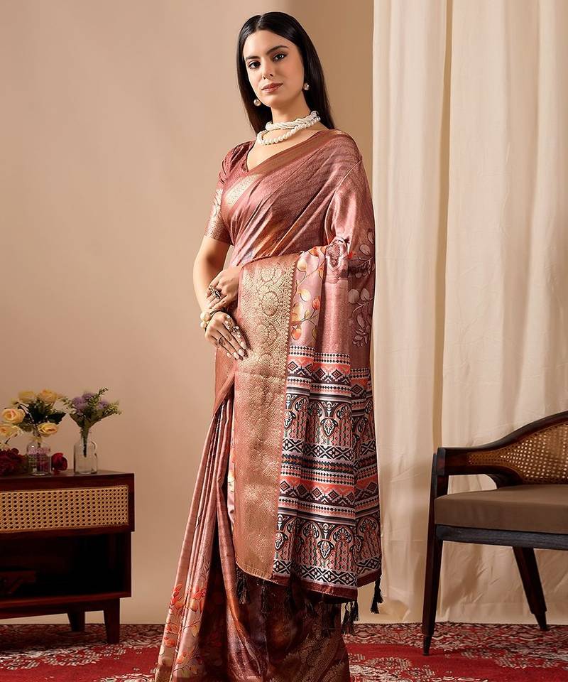 | Product Description | Fabric: Soft Lichi Silk Saree Adorned With Graceful Patola Inspired Motifs And A Rich Woven Border
