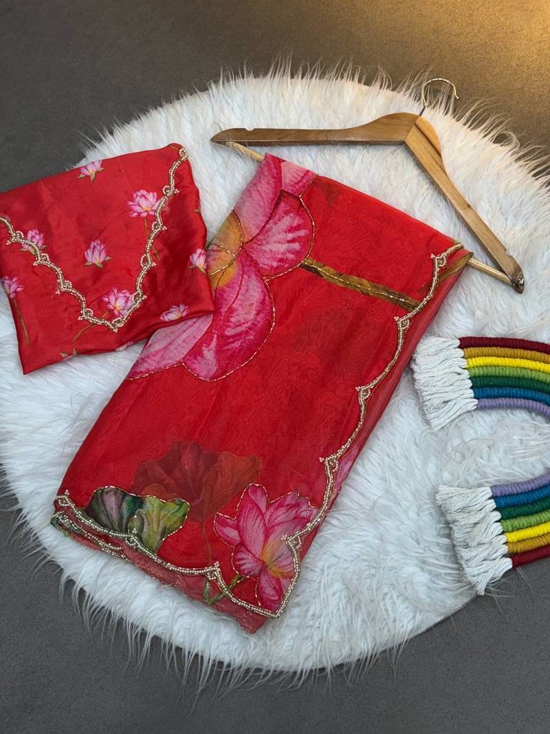 | Product Description | *Super Hit Elegant Soft Tabi Organza Celebrity Style Hand Work Cut Dana Saree* Soft Tabi Organza Flower Print Rich Elegant Color Party Wear Saree