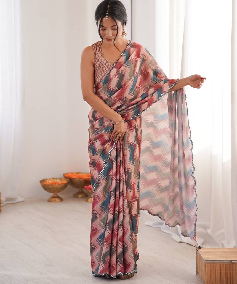 Chiffon digital print scallped border foil mirror work saree