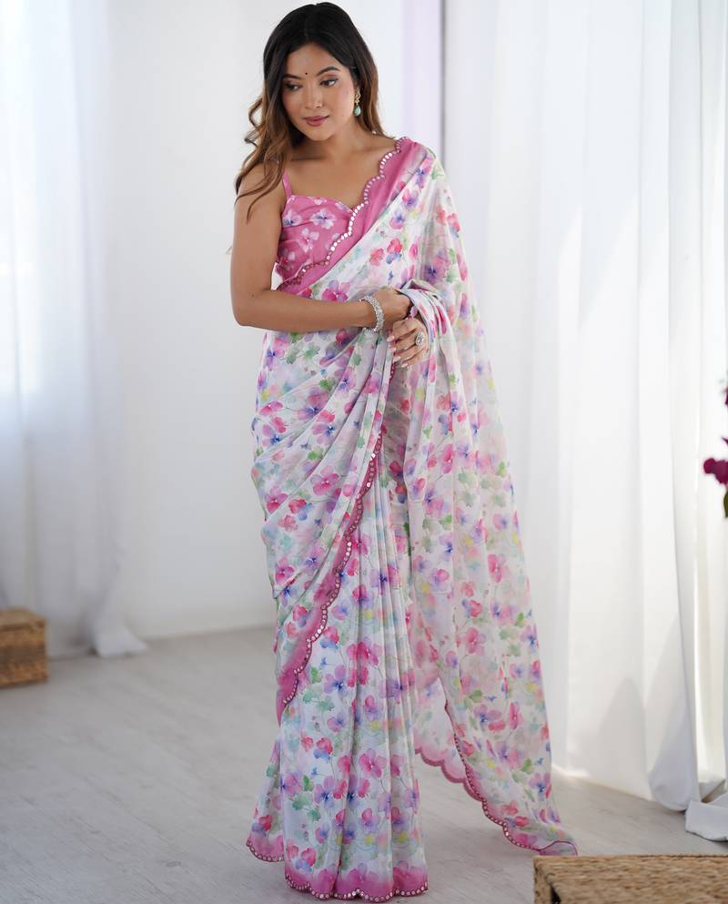 | Product Name | Chiffon Digital Print Scallped Border Foil Mirror Work Saree | |