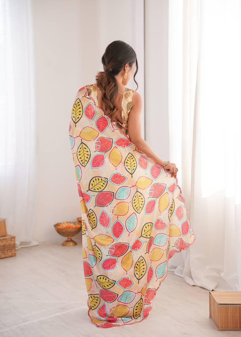 Chiffon digital print scallped border foil mirror work saree