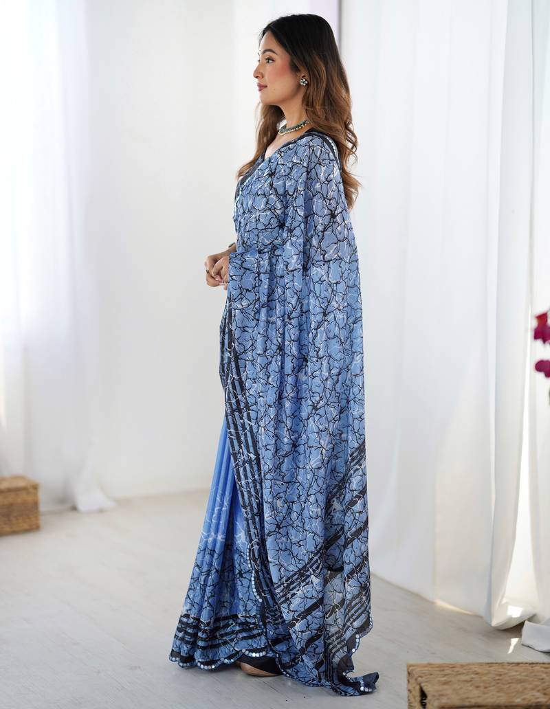 Chiffon digital print scallped border foil mirror work saree