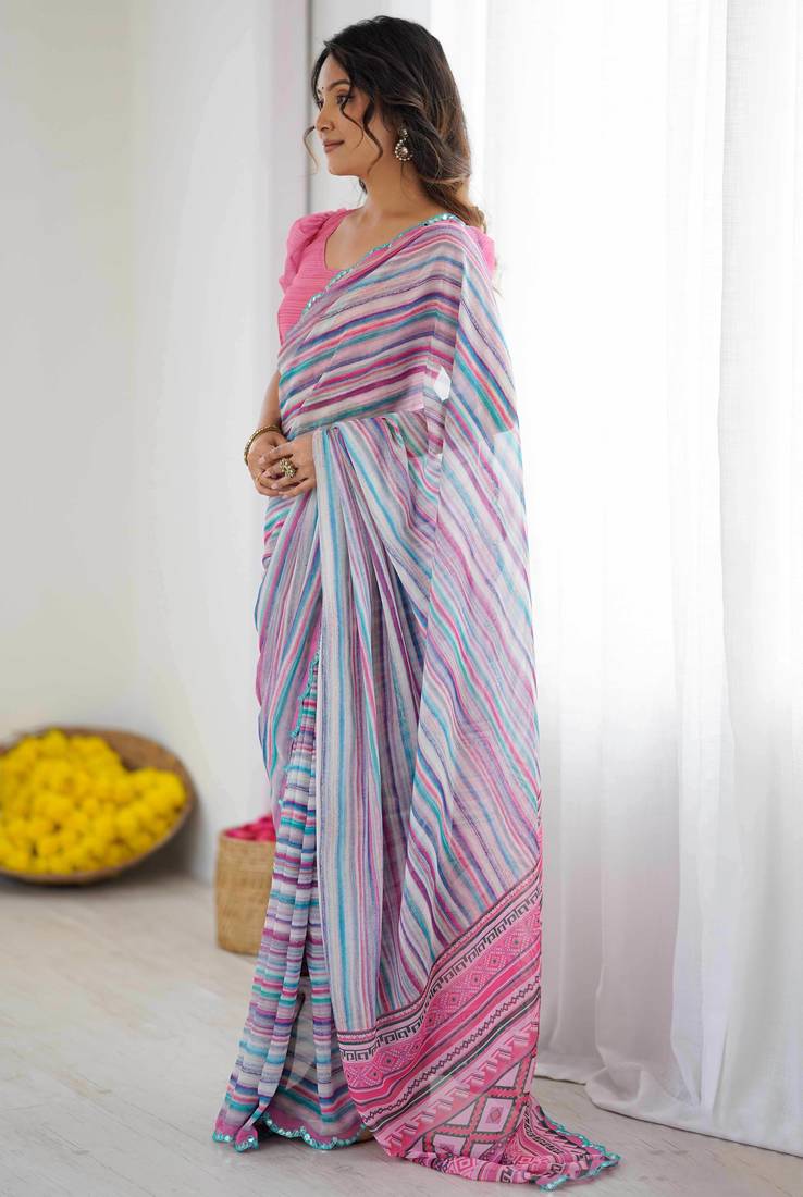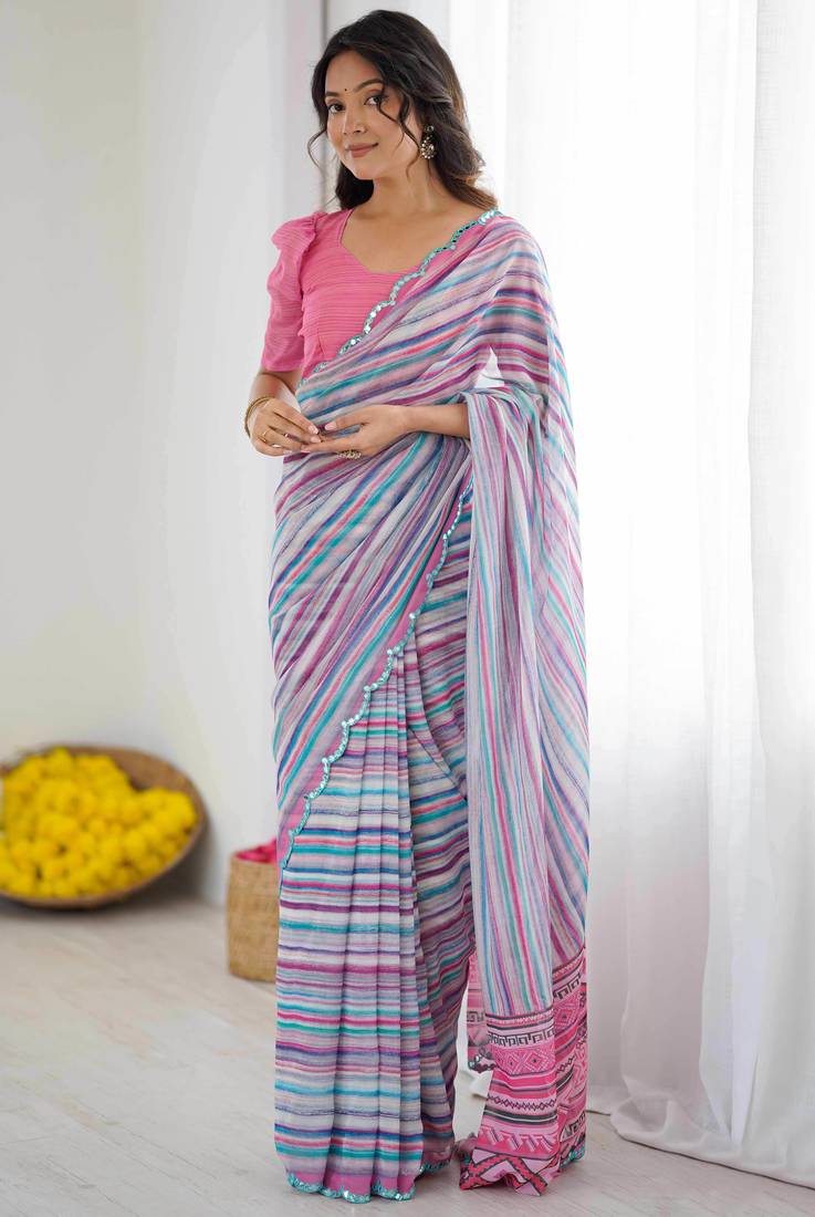 | Product Name | Georgette Digital Print Saree With Foil Mirror Work Scalloped Border | |