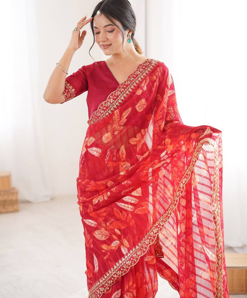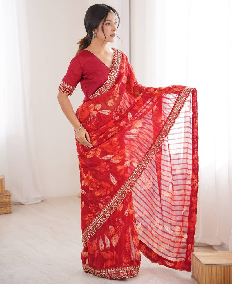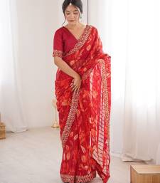 | • | Saree | : | Color- Red / Fabric- Faux Chiffon |
