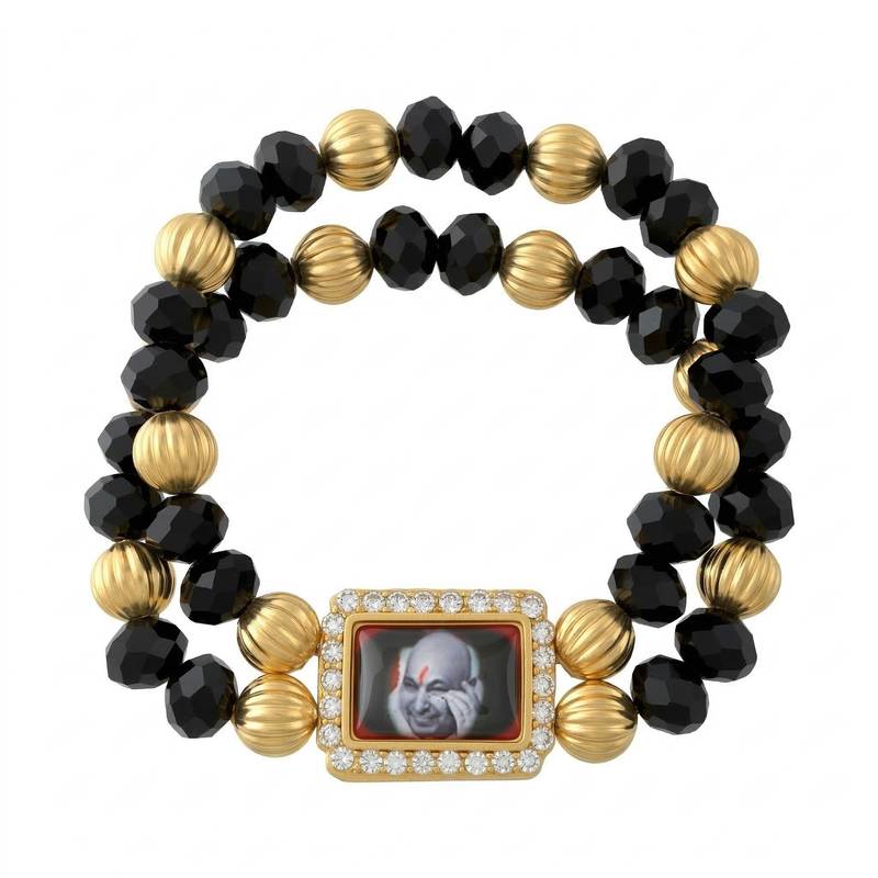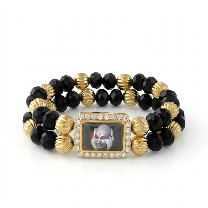 This Elegant Double‑Strand Bracelet Combines The Timeless Beauty Of Black Onyx Faceted Beads With Gold‑Plated Brass Carved Beads, Strung Together On Durable Stretch Elastic For Comfort And Style. At Its Center Lies A Pictorial Charm Of Guruji (Chattarpur Waley Guruji / Doongri Waley Guruji), Bordered With Sparkling White Cz Stones, Making It Both A Devotional And Fashionable Accessory. Guruji Is Revered By Followers As A Divine Guide And Spiritual Master, Believed To Be A Manifestation Connected With Lord Shiva. Devotees Worship Guruji For Blessings Of Peace, Protection, And Spiritual Upliftment. Wearing This Bracelet Is Not Only A Style Statement But Also A Way To Keep Guruji’s Divine Energy Close To You. Crafted For Both Men And Women, This Bracelet Blends Spiritual Symbolism With Modern Design, Making It Perfect For Daily Wear, Meditation, Or Gifting To Loved Ones.