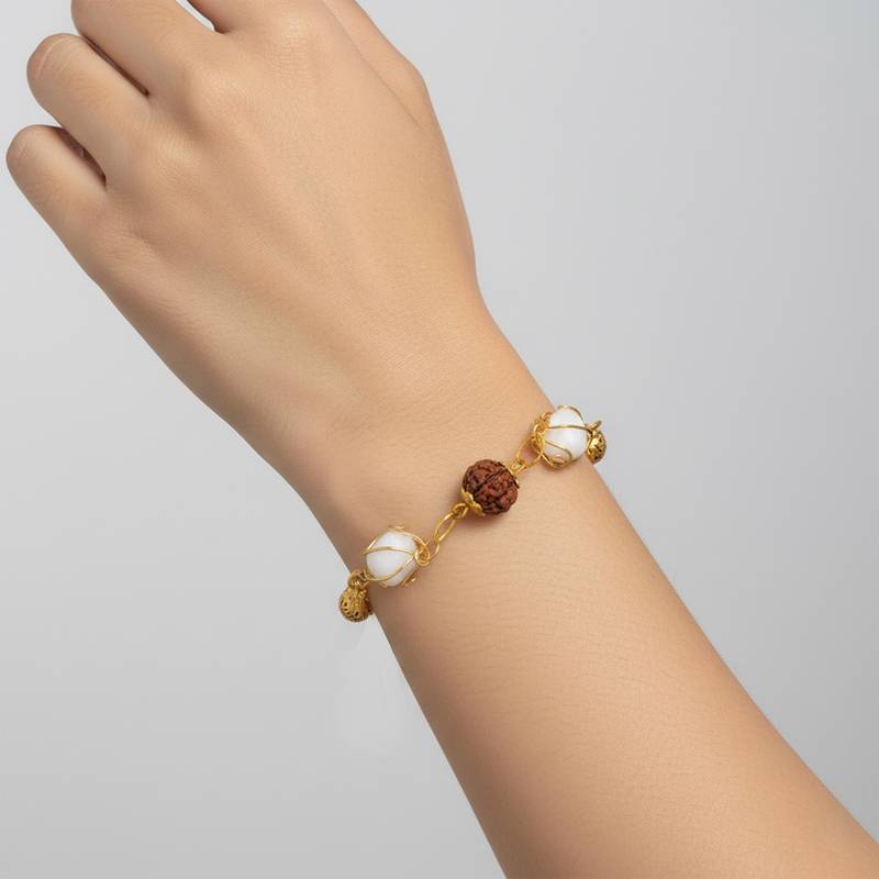This Stylish Bracelet Is Crafted With Natural Panchmukhi Rudraksh, Macch Mani , And Brass Gold Plated Beads, Making It Perfect For Both Men And Women. More Than Just A Fashion Accessory, It Carries Deep Spiritual And Religious Significance. Associated With Lord Shiva, This Bracelet Brings Peace, Strength, And Positive Energy To The Wearer. The Powerful Combination Of Rudraksh And Macch Mani Balances The Body, Mind, And Soul. Ideal As Temple Jewellery, It Enhances Grace And Charm On Every Occasion. यह प्राकृतिक पंचमुखी रुद्राक्ष, मच्छ मणि और ब्रास गोल्ड प्लेटेड बीड्स से बना स्टाइलिश कंगन पुरुषों और महिलाओं दोनों के लिए उपयुक्त है। यह आभूषण न केवल फैशन का हिस्सा है बल्कि आध्यात्मिक ऊर्जा और धार्मिक महत्व भी प्रदान करता है। भगवान शिव से जुड़ा यह कंगन पहनने वाले को शांति, शक्ति और सकारात्मक ऊर्जा का अनुभव कराता है। रुद्राक्ष और मच्छ मणि का संयोजन शरीर, मन और आत्मा को संतुलित करता है। यह कंगन मंदिर ज्वेलरी के रूप में भी आदर्श है और हर अवसर पर आकर्षण और गरिमा बढ़ाता है।
