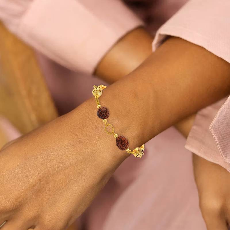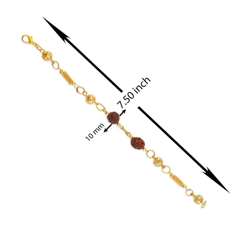 This Stylish Bracelet Is Crafted With Natural Panchmukhi Rudraksh And Brass Gold Plated Beads, Making It Perfect For Both Men And Women. More Than Just A Fashion Accessory, It Carries Deep Spiritual And Religious Significance. Associated With Lord Shiva, This Bracelet Brings Peace, Strength, And Positive Energy To The Wearer. The Powerful Combination Of Rudraksh And Richness Of Brass Golden Beads Balances The Body, Mind, And Soul. Ideal As Temple Jewellery, It Enhances Grace And Charm On Every Occasion. यह प्राकृतिक पंचमुखी रुद्राक्ष, और ब्रास गोल्ड प्लेटेड बीड्स से बना स्टाइलिश ब्रेसलेट पुरुषों और महिलाओं दोनों के लिए उपयुक्त है। यह आभूषण न केवल फैशन का हिस्सा है बल्कि आध्यात्मिक ऊर्जा और धार्मिक महत्व भी प्रदान करता है। भगवान शिव से जुड़ा यह ब्रेसलेट पहनने वाले को शांति, शक्ति और सकारात्मक ऊर्जा का अनुभव कराता है। रुद्राक्ष का संयोजन शरीर, मन और आत्मा को संतुलित करता है। यह ब्रेसलेट मंदिर ज्वेलरी के रूप में भी आदर्श है और हर अवसर पर आकर्षण और गरिमा बढ़ाता है।