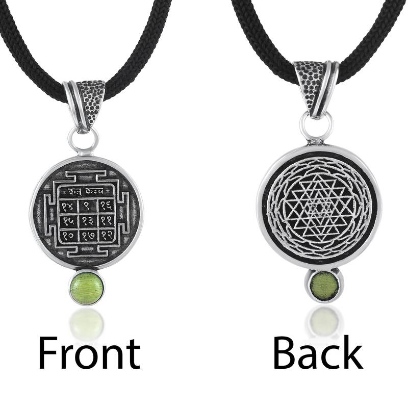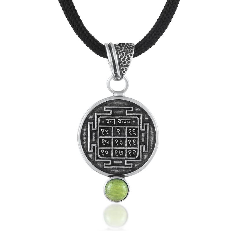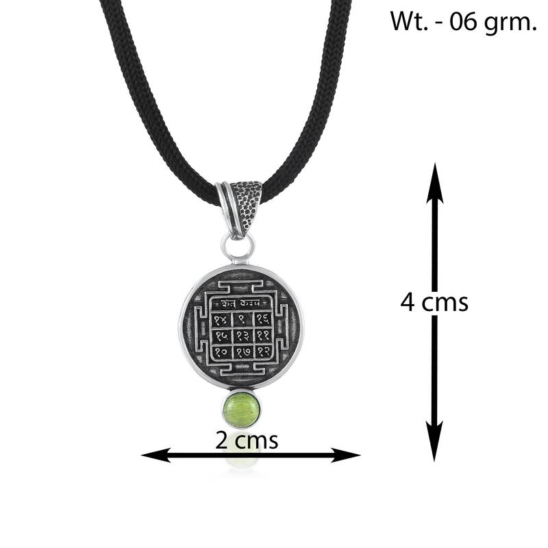 Experience Spiritual Protection And Planetary Balance With This Ketu Kawach Pendant, Crafted In Pure Brass And With Antique Silver Plating. And Designed As A 4 Cm Reversible Coin. One Side Features The Sacred Ketu Yantra, While The Other Holds The Kawach — Together Offering A Powerful Shield Against The Malefic Effects Of Planet Ketu. Set With A Calming Green Chrysoberyl Cats Eye (Lehsuniya) Gemstone And Suspended On A Silky Cotton Thread, This Pendant Is Ideal For Those Seeking Relief From Karmic Obstacles, Emotional Instability, And Spiritual Confusion. Highly Recommended By Astrologers, This Unisex Pendant Is Especially Beneficial For Individuals Experiencing The Adverse Effects Of Ketu In Their Birth Chart — Such As Delays, Detachment, Or Sudden Disruptions. People Widely Beleive Wearing It Regularly Helps Align Ones Energy, Enhance Intuition, And Restore Inner Peace.