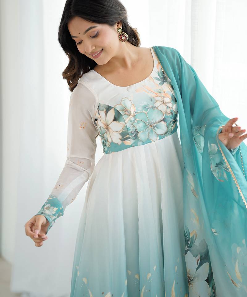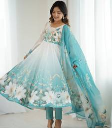 | Product Name | Aqua Blue Floral Print Organza Three Piece Anarkali Suit | |