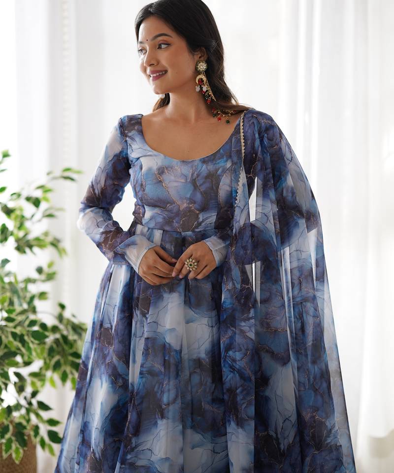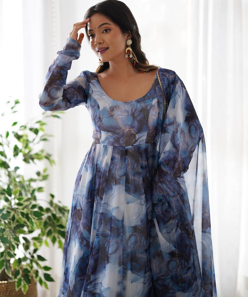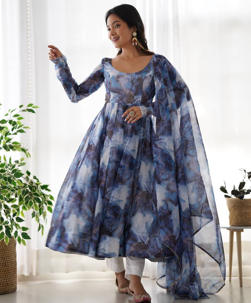 | Product Name | Astonishing Navy Blue Marble Print Organza Event Wear Anarkali Suit | |