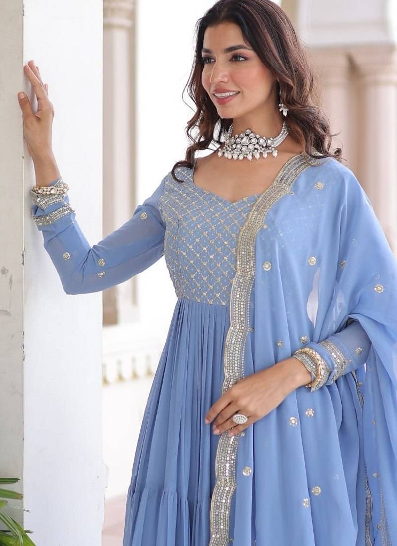 | Product Name | Mita Sky Blue Faux Georgette Sequins Zari Embroidered Gown With Dupatta | |