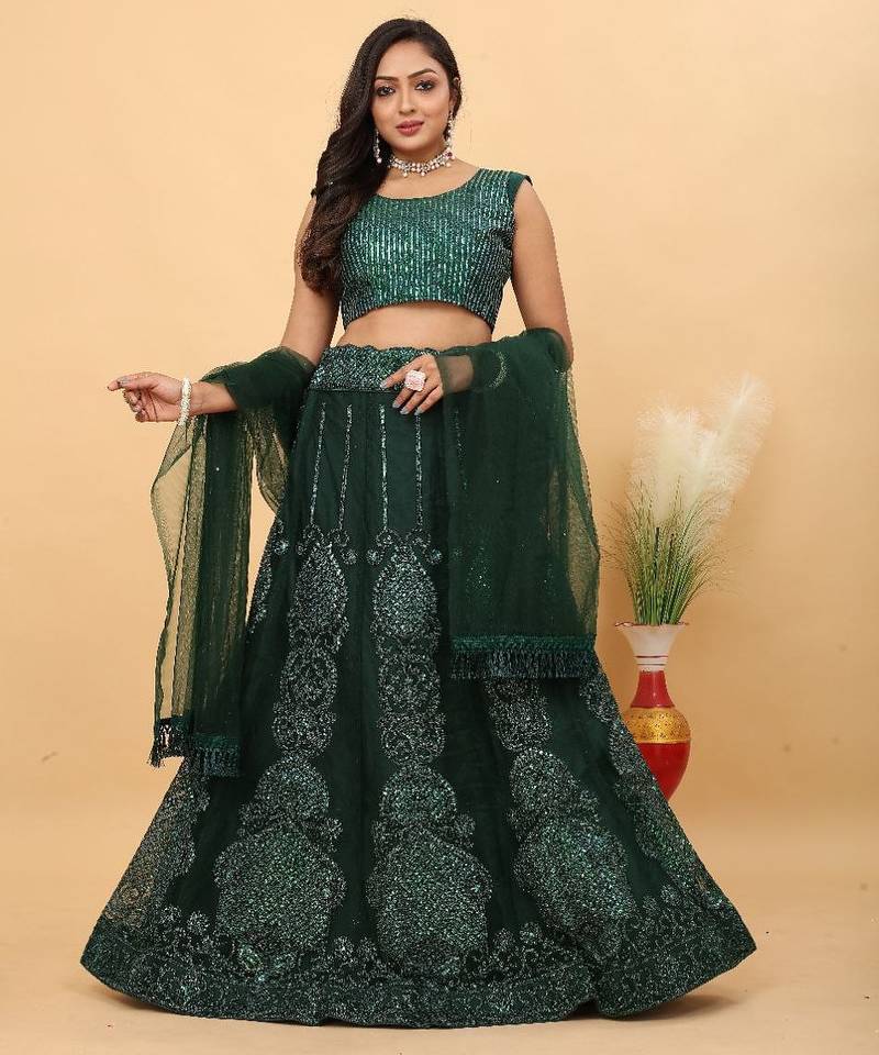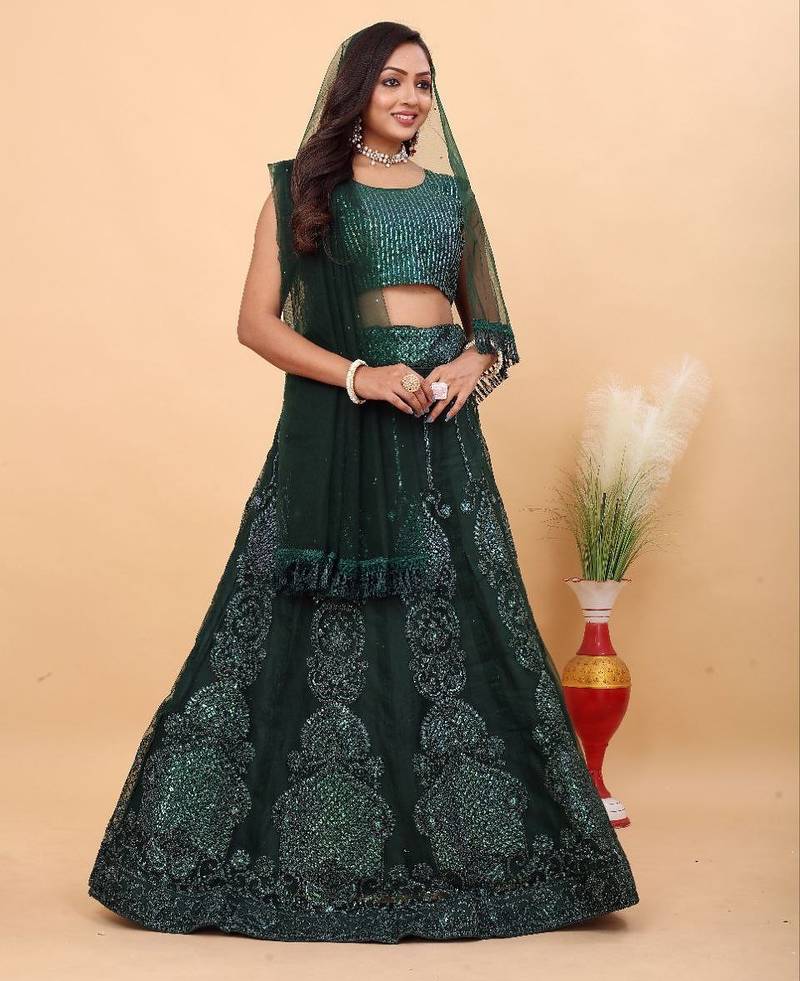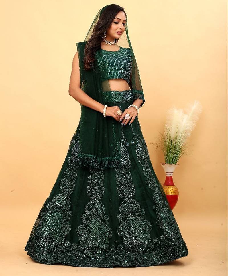 Product Description | Step Into A World Of Grandeur With Our Premium Net Embellished Lehenga Set—Crafted With Intricate Sequins, Zari, And Coding Work For An Opulent Appeal. This Heavily Flared Lehenga Comes With A Double Inner Covering And Cancan, Ensuring A Royal Look. Paired With A Diamond Silk Embroidered Blouse And A Premium Net Dupatta With Diamond Work And Heavy Jhalar Lace, This Set Is A Masterpiece For Weddings And Festive Celebrations! |