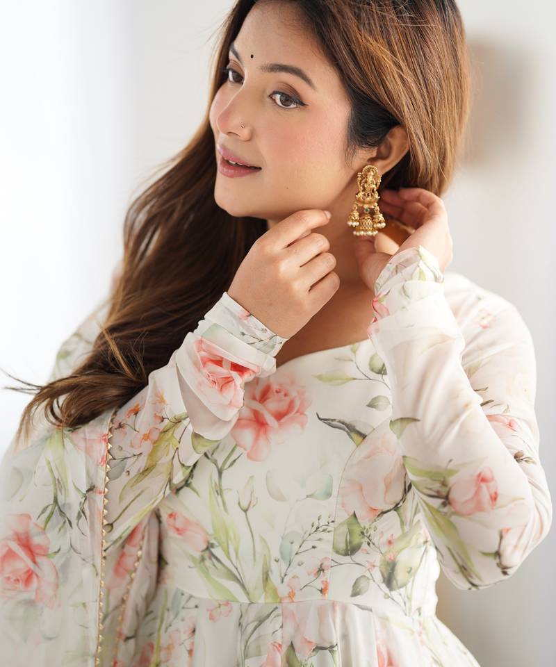| Product Description | Unveil Your Inner Grace With This Off White Organza Silk Anarkali Suit Adorned In A Captivating Floral Digital Print. |