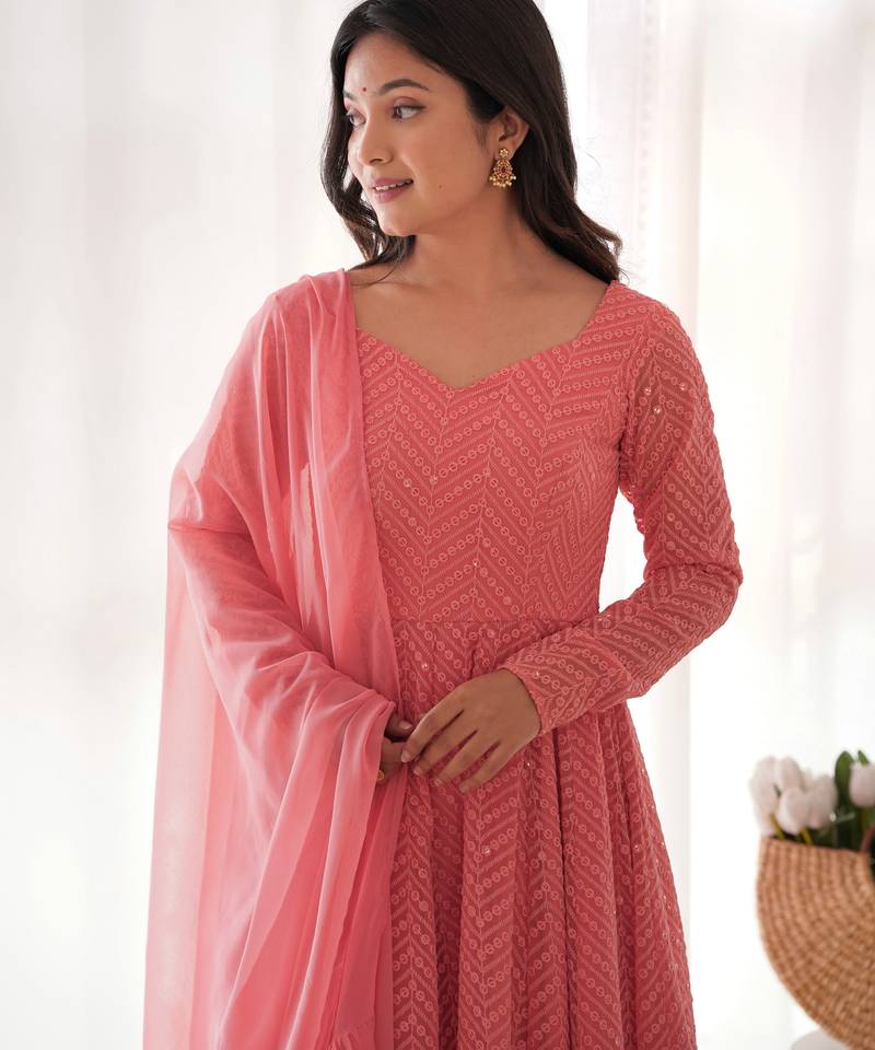 | Product Description | Add A Soft And Elegant Touch To Your Ethnic Wardrobe With This Peach Embroidered Georgette Anarkali Set With Dupatta. |