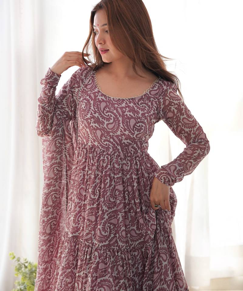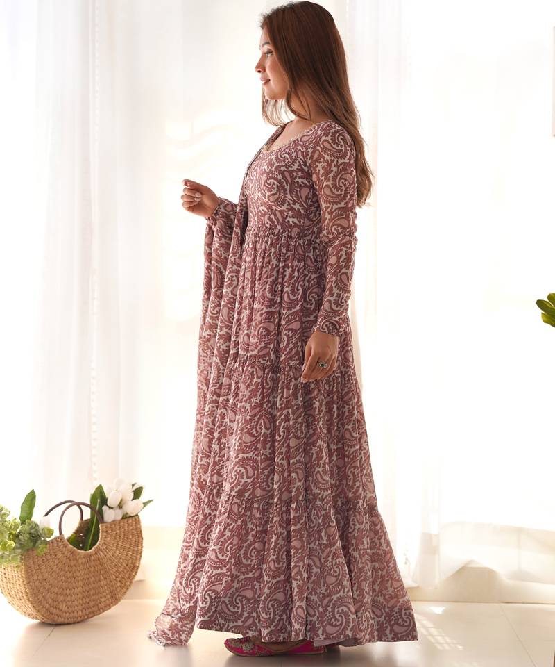 | Product Description | The Pink Faux Georgette Digital Print Anarkali Suit Is A Graceful Ensemble Designed To Make A Statement On Special Occasions. |