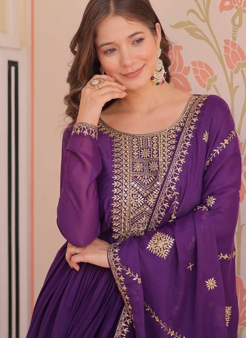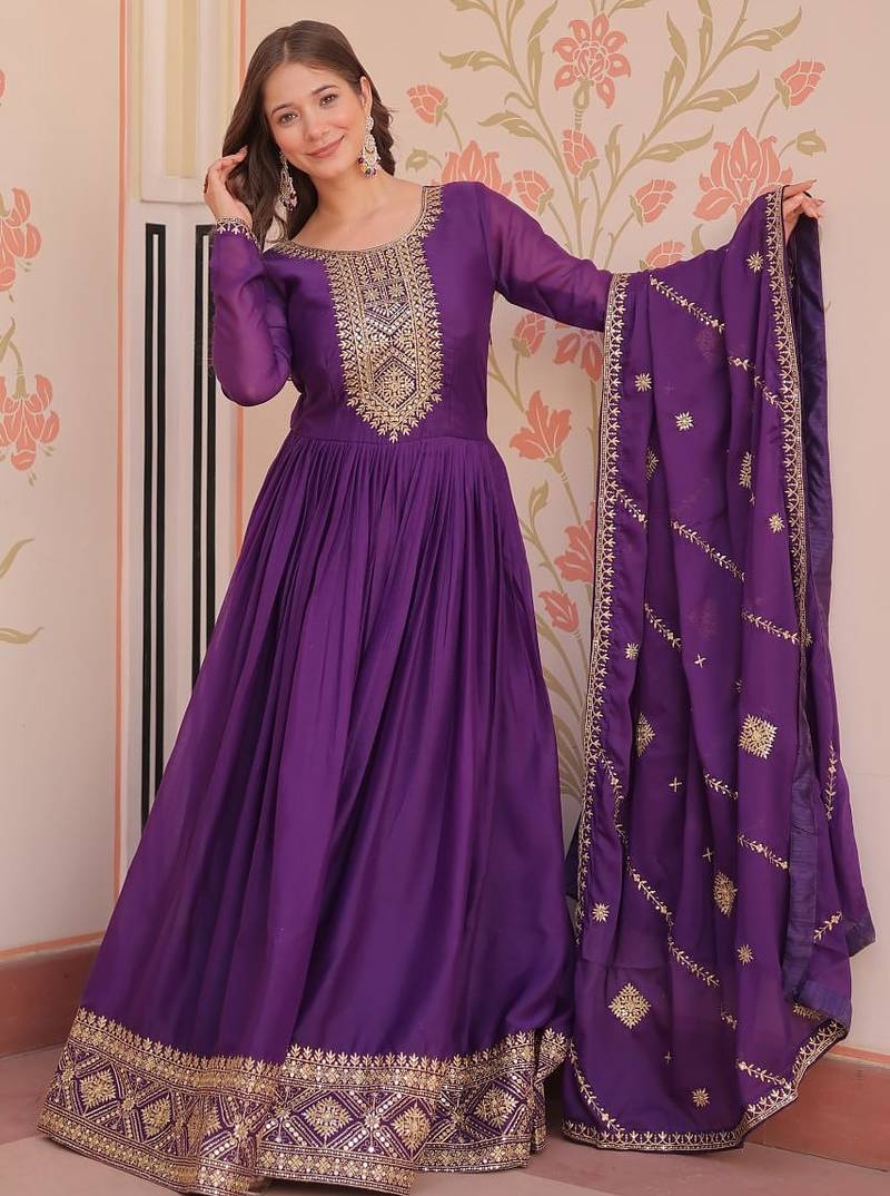 Purple star georgette zari sequins embroidered gown with dupatta stitched
