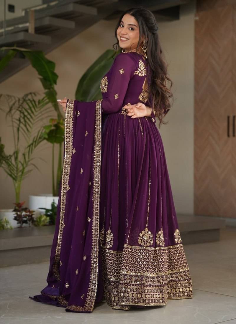 Royal purple georgette zari and sequins embroidered gown with dupatta stitched