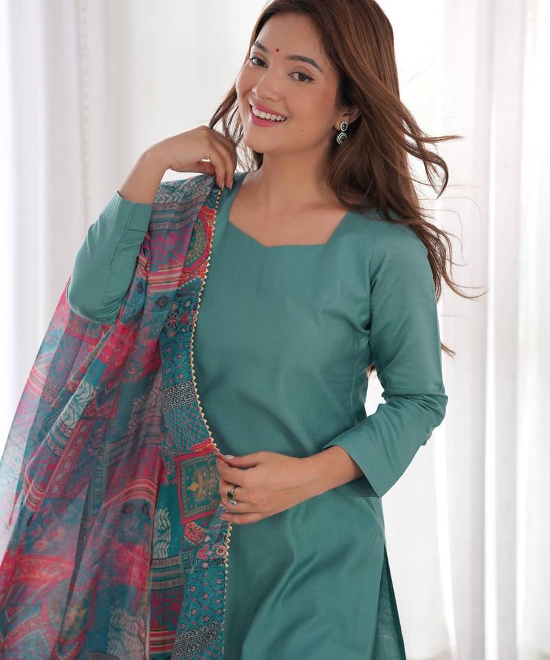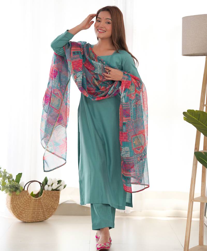 | Product Description | Step Into Effortless Style With This Sea Green Color Viscose Ready To Wear Three Piece Kurti Suit. |