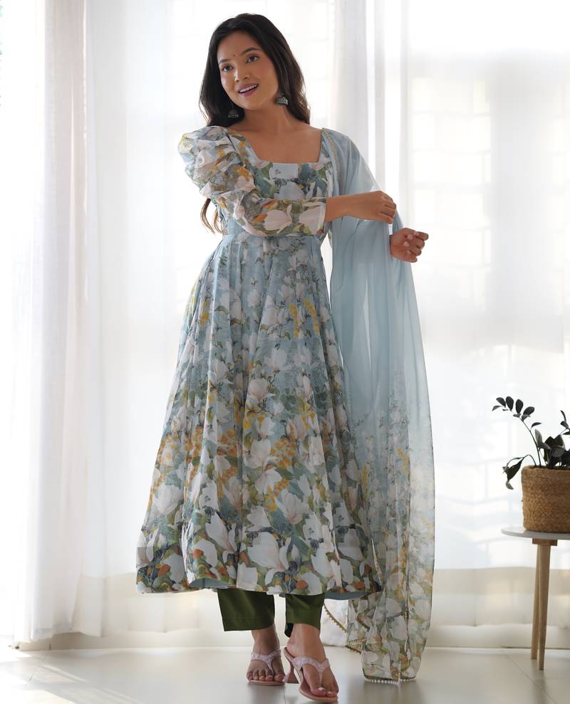| Product Name | Sky Color Pure Soft Organza Three Piece Anarkali Suit | |