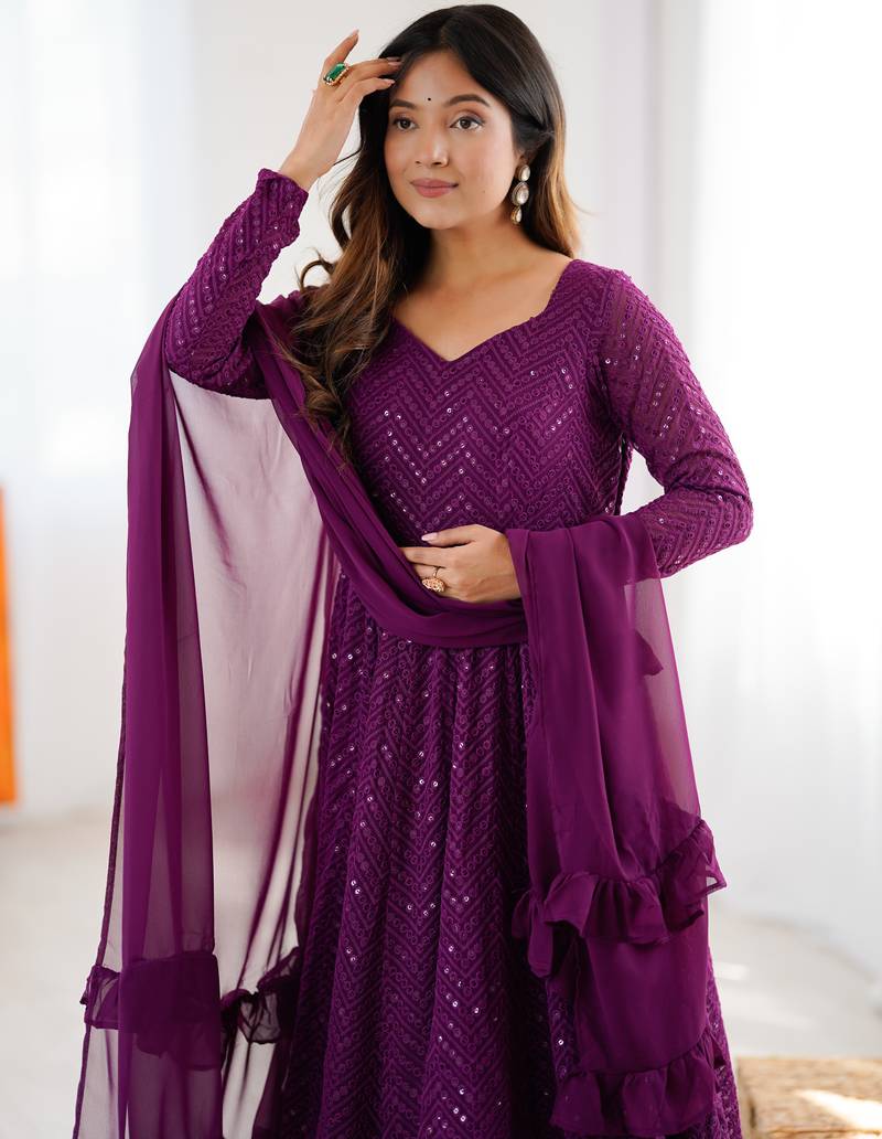 | Product Description | Elegant And Timeless, This Wine Colored Anarkali Suit Is Crafted From Flowy Georgette And Adorned With Intricate Lucknowi Embroidery. Paired With Matching Bottoms And A Dupatta, It’s Perfect For Weddings, Festive Occasions, And Traditional Celebrations. |