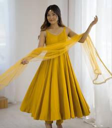 Yellow color chanderi pure roman silk anarkali suit stitched