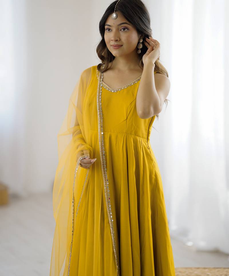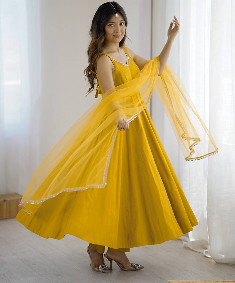 | Product Name | Yellow Color Chanderi Pure Roman Silk Anarkali Suit | |