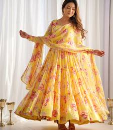 Yellow faux georgette floral print anarkali suit stitched