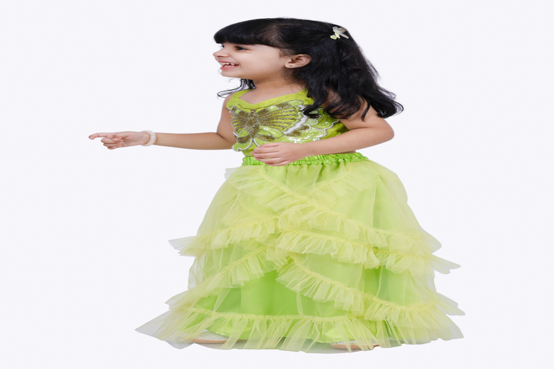 | Product Description | Elaisha Woven Sleeveless Placement Embroidered Top With Net Lehenga Limegreen |