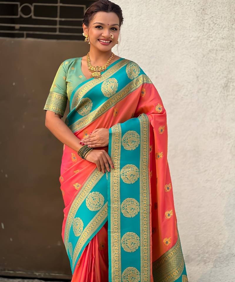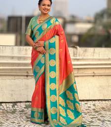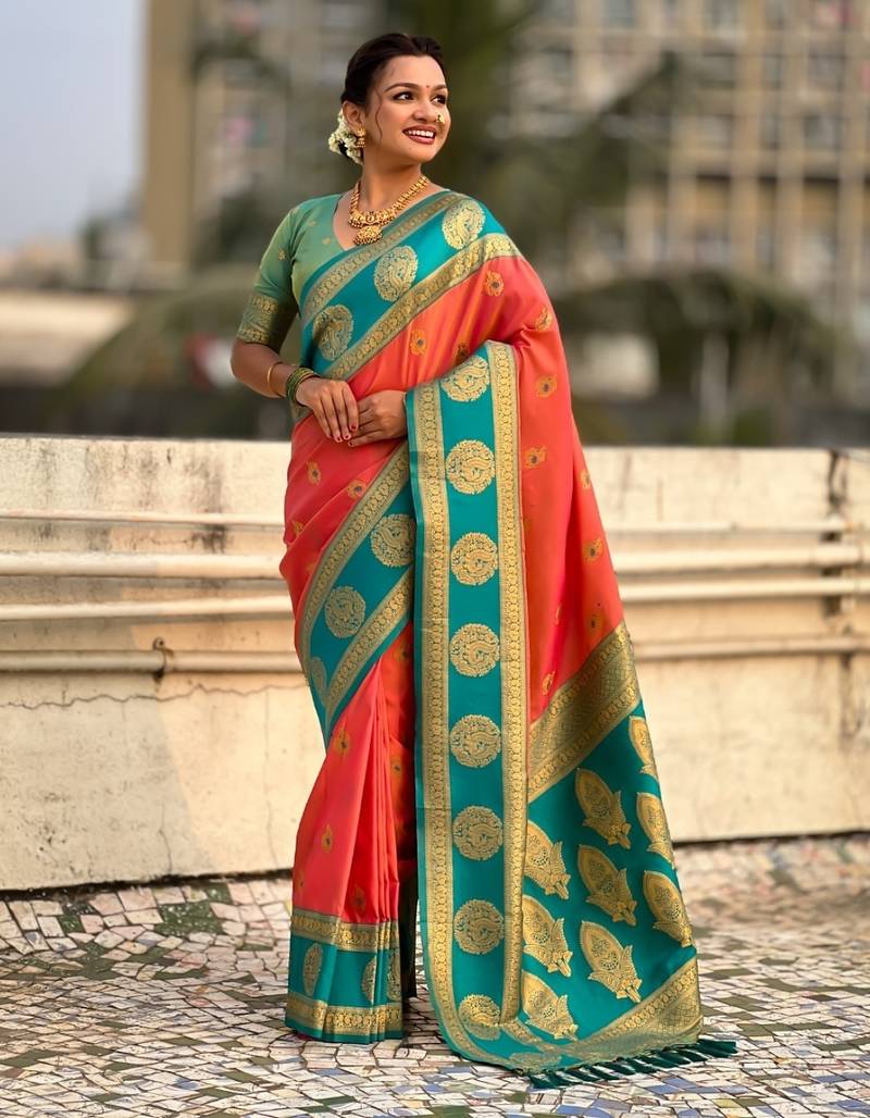 Multicolor peacock zari woven soft art silk festive wear saree with unstitched blouse
