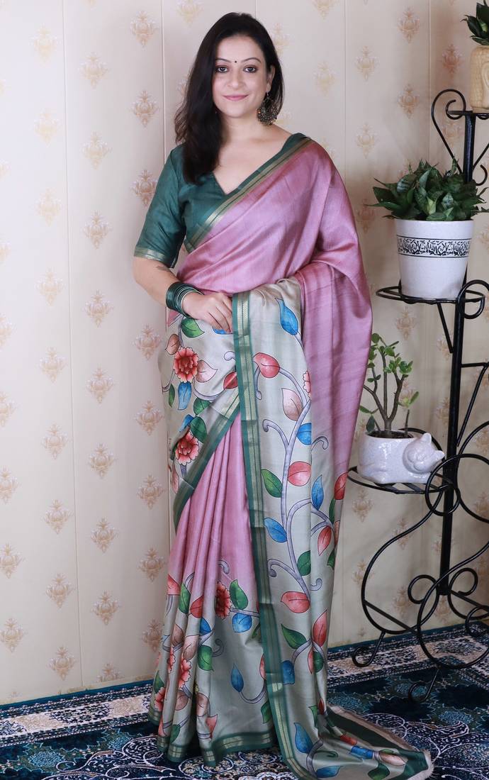 Soft tussar silk blend kalamkari unique printed zari woven saree