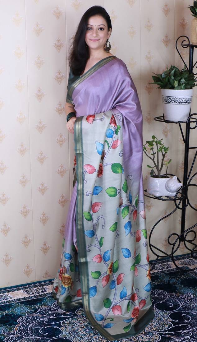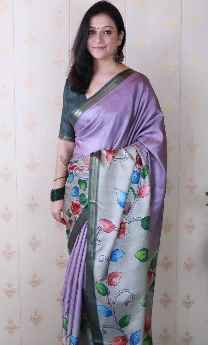 Soft tussar silk blend kalamkari unique printed zari woven saree