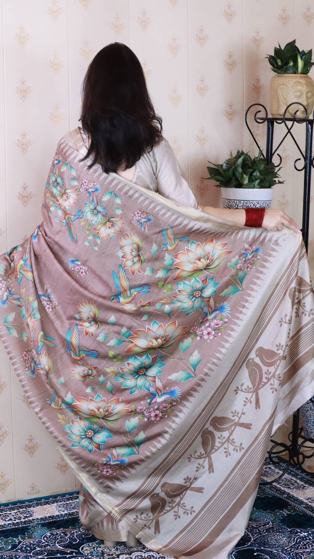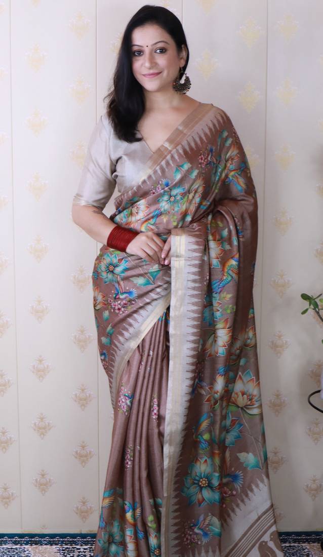 | Product Description | Experience Timeless Sophistication With This Soft Tussar Silk Saree, Where Nature Inspired Artistry Meets Traditional Weaving Excellence. Delicate Bird Motifs Grace The Entire Body, Evoking A Sense Of Tranquility And Refined Elegance. The Saree Features Meticulously Woven Arrow Zari Borders On Both Sides, Providing Striking Definition And A Luxurious Finish. A Richly Detailed Digitally Printed Pallu Serves As The Crowning Element, Showcasing Intricate Craftsmanship. Complemented By A Contrast Printed Plain Blouse, This Ensemble Offers Versatility For Both Special Occasions And Sophisticated Everyday Styling. The Soft Drape Of Tussar Silk Ensures Comfort While Maintaining The Structured Grace That Defines Premium Saree Wear. |