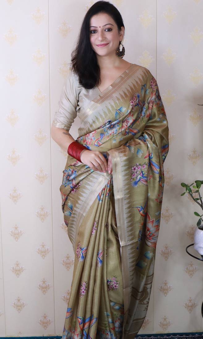 | Product Description | Experience Timeless Sophistication With This Soft Tussar Silk Saree, Where Nature Inspired Artistry Meets Traditional Weaving Excellence. Delicate Bird Motifs Grace The Entire Body, Evoking A Sense Of Tranquility And Refined Elegance. The Saree Features Meticulously Woven Arrow Zari Borders On Both Sides, Providing Striking Definition And A Luxurious Finish. A Richly Detailed Digitally Printed Pallu Serves As The Crowning Element, Showcasing Intricate Craftsmanship. Complemented By A Contrast Printed Plain Blouse, This Ensemble Offers Versatility For Both Special Occasions And Sophisticated Everyday Styling. The Soft Drape Of Tussar Silk Ensures Comfort While Maintaining The Structured Grace That Defines Premium Saree Wear. |