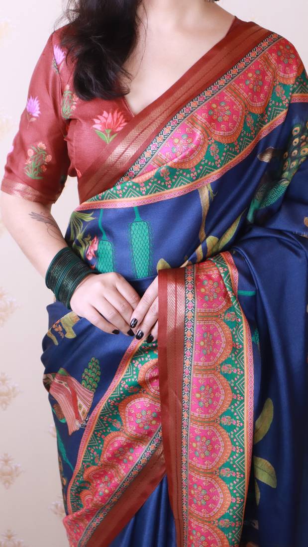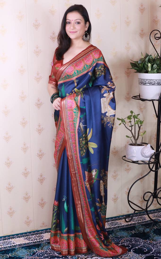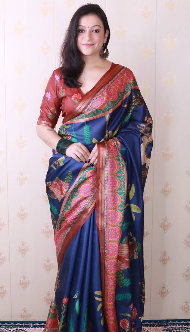 Soft tussar silk blend pichwai traditional printed zari woven saree