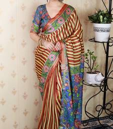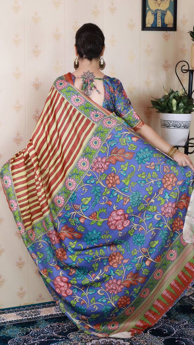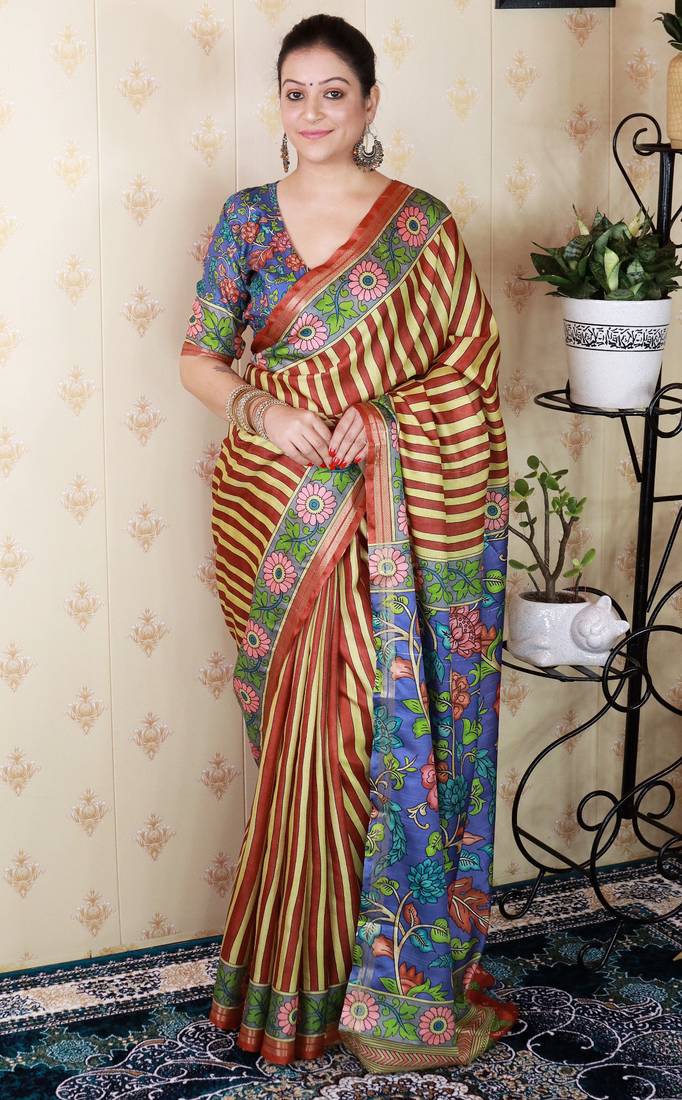 | Product Description | Experience Refined Elegance With This Sophisticated Soft Tussar Silk Saree, Featuring Graceful Striped Patterns Across The Body That Showcase Understated Luxury. The Saree Is Adorned With An Ornate Arrow Zari Woven Border Embellished With Authentic Kalamkari Prints On Both Edges, Reflecting Centuries Of Hand Painted Textile Artistry. The Pallu Showcases Intricate Kalamkari Floral Designs That Command Attention With Their Detailed Craftsmanship. Paired With A Coordinating Kalamkari Printed Blouse, This Saree Effortlessly Transitions From Traditional Gatherings To Contemporary Occasions, Offering Versatile Sophistication For The Discerning Wearer. |