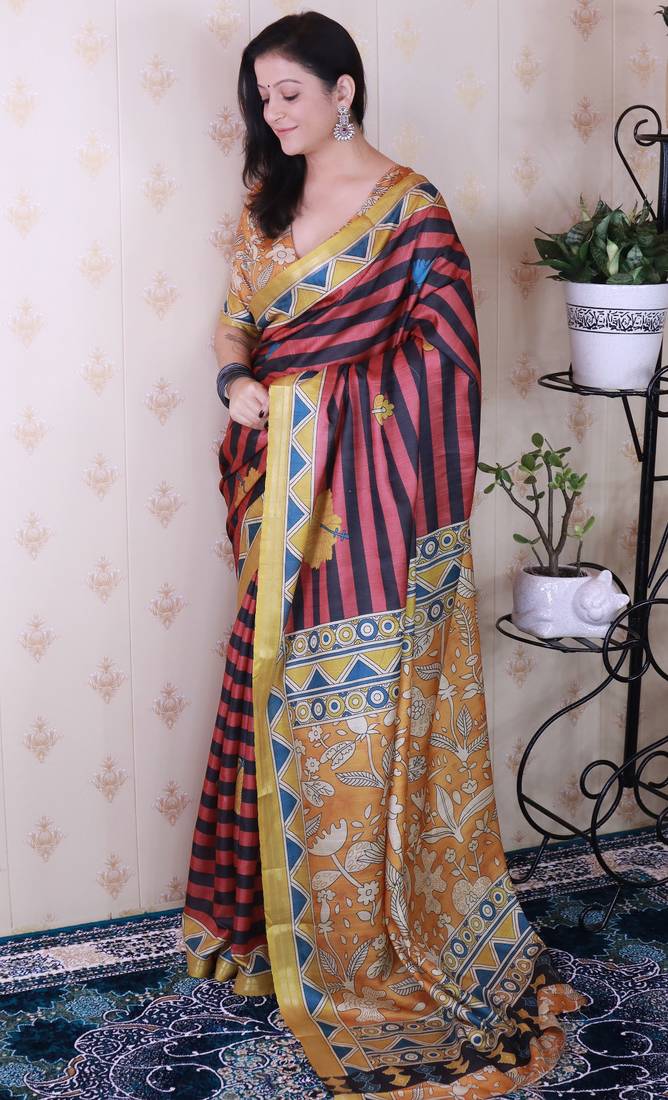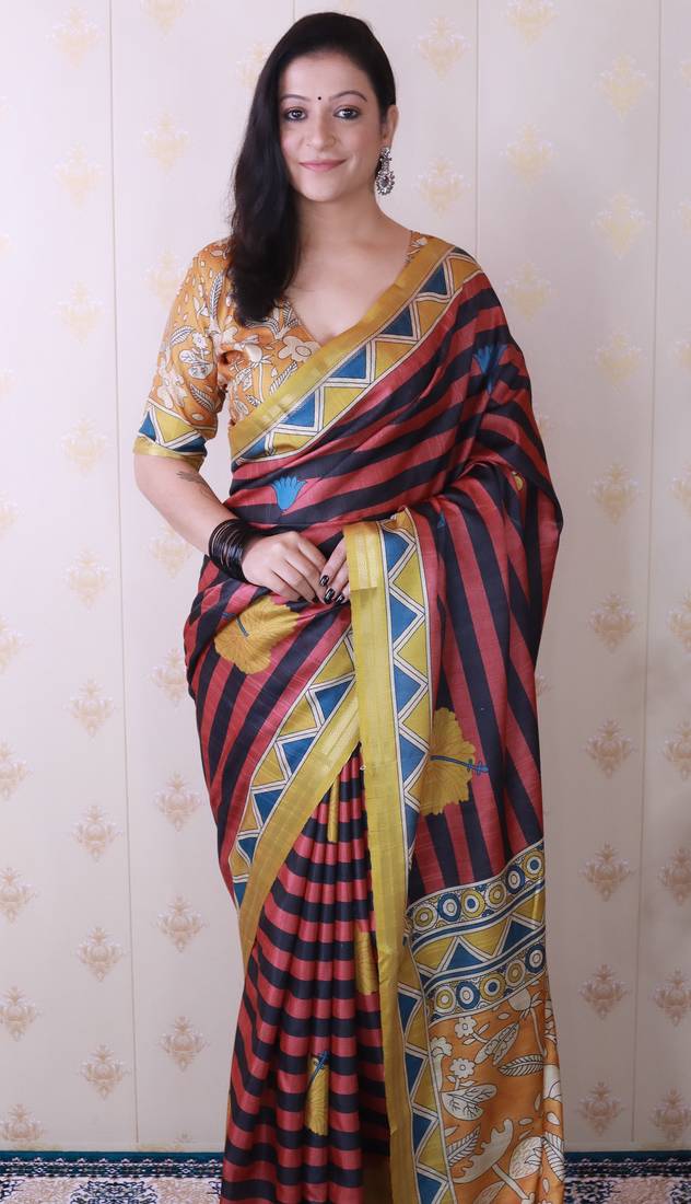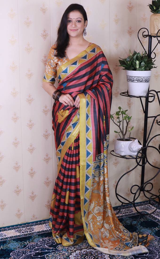 | Product Description | Experience Refined Elegance With This Sophisticated Soft Tussar Silk Saree, Featuring Graceful Striped Patterns Across The Body That Showcase Understated Luxury. The Saree Is Adorned With An Ornate Arrow Zari Woven Border Embellished With Authentic Kalamkari Prints On Both Edges, Reflecting Centuries Of Hand Painted Textile Artistry. The Pallu Showcases Intricate Kalamkari Floral Designs That Command Attention With Their Detailed Craftsmanship. Paired With A Coordinating Kalamkari Printed Blouse, This Saree Effortlessly Transitions From Traditional Gatherings To Contemporary Occasions, Offering Versatile Sophistication For The Discerning Wearer. |