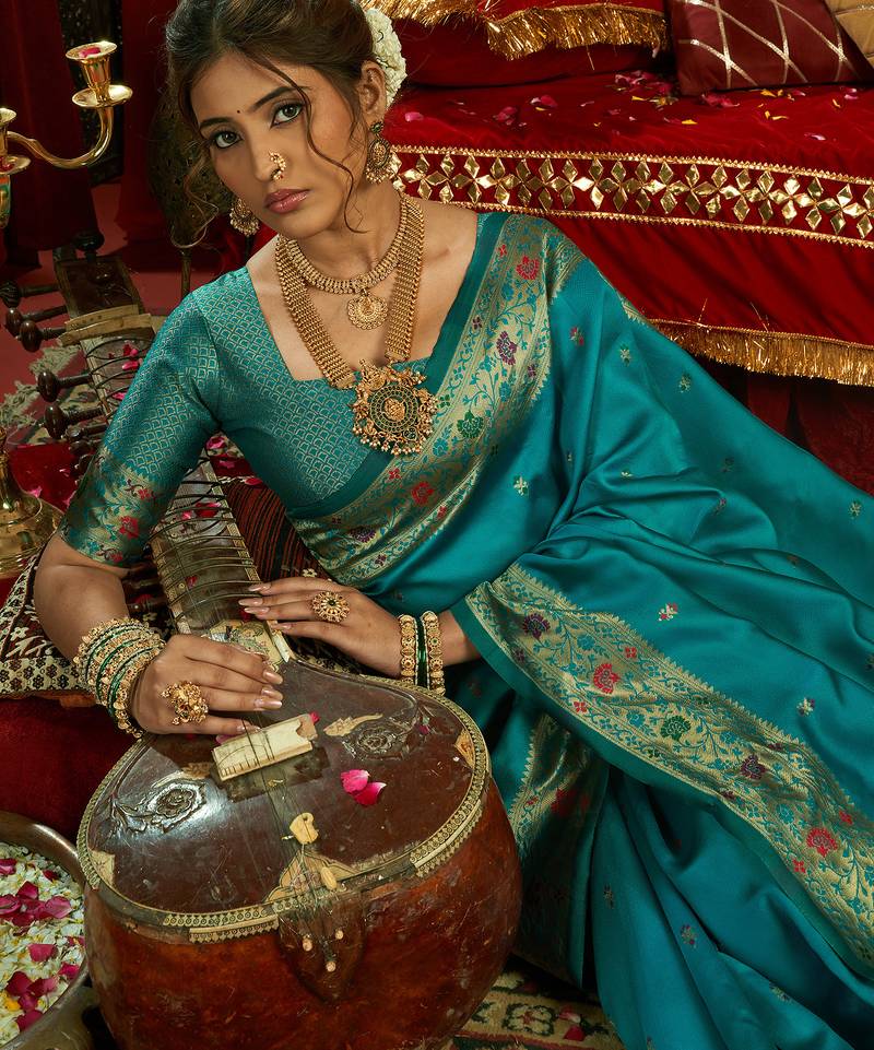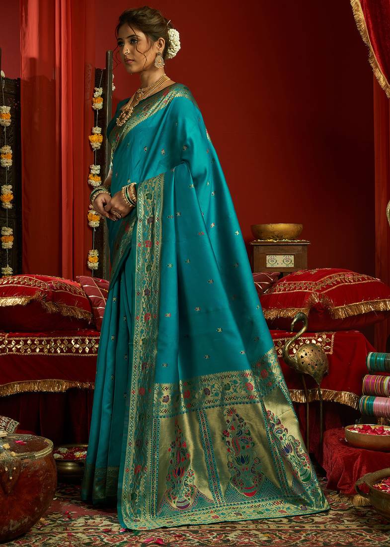 | Product Name | Aqua Blue Silk Floral Motifs Woven Work Paithani Saree | |